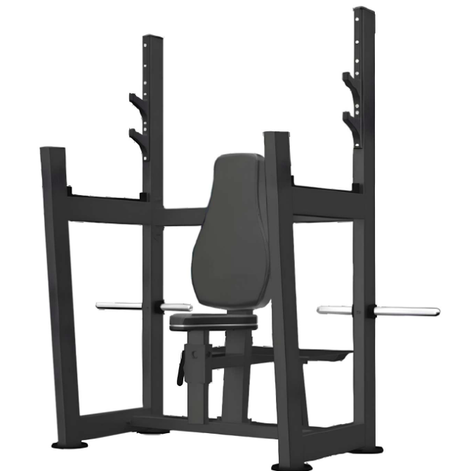 Los usuarios tienen fácil acceso a la barra olímpica, y el cojín del asiento ajustable y el respaldo reclinable brindan un rango de movimiento sin obstáculos con una rotación externa mínima de la articulación del hombro.